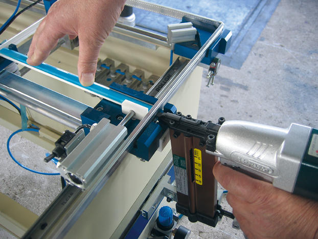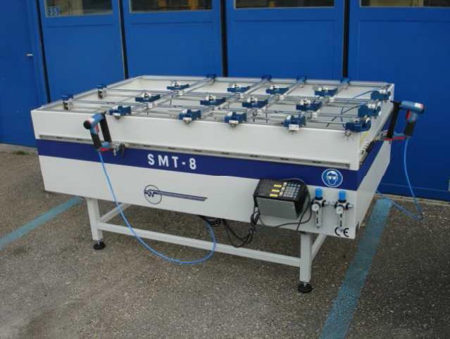 La table d’agrafage « SMT » est la solution idéale pour assembler parfaitement des grilles de fenêtre. Le montage de grilles dans des angles précis et parfaitement parallèle devient un standard pour la SMT-8. Un système détectant la position réelle s'assure que l'on centre précisément chaque grille. La SMT peut accepter tous les types de croisillons de petits bois dorés 8 x 26 aux profils standard 8 x 45 sans aucun changement de pièces.