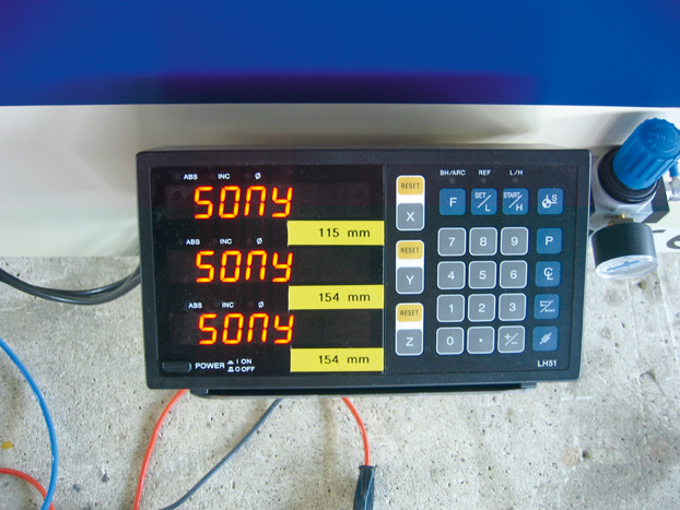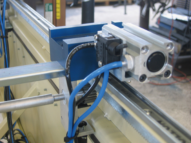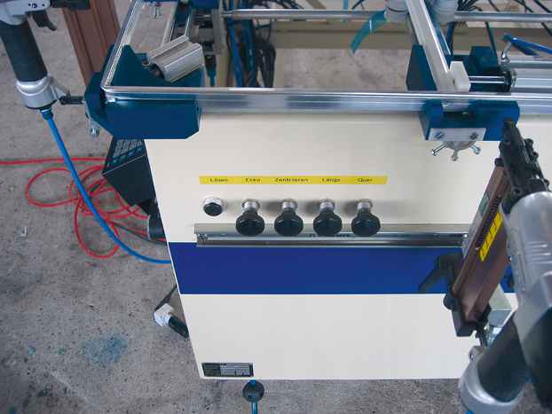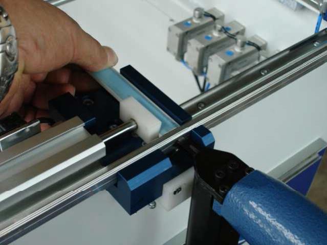 C/ En option, un système d'arrêt électronique représentant une exactitude dimensionnelle plus haute peut être adapté. Le micro-ajustement d'axe de « jumeau » empêche le besoin de l'insertion importune dans le cas de tolérances de livraison ou des profils recouverts différemment de laque ou renolit.